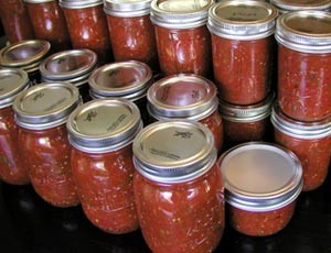 Measure after peeling, chopping and draining. 2-1/2 cups onion, chopped Roughly a 1/4" chopped size (this is the size used in the NCHFP testing - a little larger won't matter, but try not to have the pieces larger than 1/2" maximum). 1-1/2 cups green pepper, chopped Roughly a 1/4" chopped size. 3 - 5 jalapenos, chopped Any combination of green, red, whatever color peppers is fine. 3-5 jalapenos equates to roughly 1/4 cup, so total peppers cannot exceed 1-3/4 cups. For a spicier salsa, you can decrease the sweet peppers and increase the hot peppers by the same amount. Or, you can use hotter peppers (such as habaneros or serranos) but the TOTAL amount of peppers cannot exceed 1-3/4 cups. 6 cloves garlic, minced or finely diced Do not increase. Small differences in size of cloves should not matter. 2 teaspoons cumin For taste only. Can be reduced or left out entirely. 2 teaspoons ground black pepper For taste only. Can be reduced or left out entirely. Any dried ground pepper such as cayenne may be substituted for a portion of or all of the black pepper. 2 tablespoons (same measurement as 1/8 cup) canning salt For taste only. Can be reduced or left out entirely. 1/4 cup fresh cilantro, chopped Can be reduced or left out entirely. Do not increase. Dried cilantro or other dried herbs may be added, but not more fresh herbs (fresh herbs change the pH - dried herbs do not). Add additional fresh herbs only after you open the jar. 1/3 cup sugar For taste only. Can be reduced or left out entirely. 1 cup 5% apple cider vinegar Can use any flavor vinegar (white, cider, etc.) as long as acidity is at least 5%. However, you can substitute bottled lemon or lime juice in any proportions according to taste (for example, 1/3 cup vinegar, 1/3 cup lemon juice, 1/3 cup lime juice) as long as the total equals one cup. 2 cups (16 oz.) tomato sauce Can be reduced slightly. See "Canning & Processing" notes below. 2 cups (16 oz.) tomato paste For texture only. Can be reduced or left out entirely.